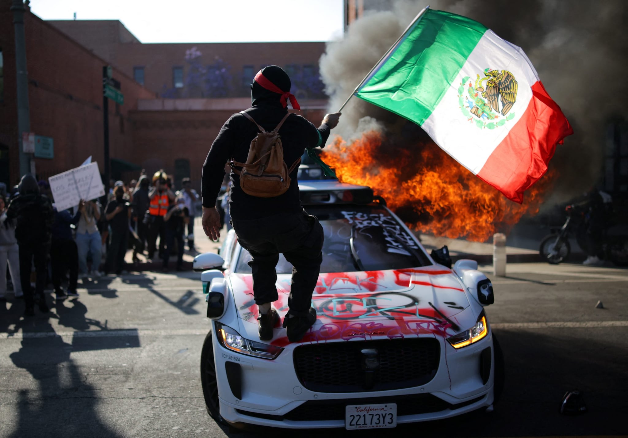 Los Angeles Riots Live: एलन मस्क ने लॉस एंजिल्स में ICE विरोध प्रदर्शनों के दौरान एक प्रदर्शनकारी की तस्वीर X पर शेयर की, जो जली हुई कार पर मैक्सिकन झंडा लेकर खड़ा था. मस्क ने लिखा, ‘यह उचित नहीं है.’ यह घटना सिविक सेंटर में हिंसक प्रदर्शनों के बीच हुई, जहां पुलिस ने रबर बुलेट्स का इस्तेमाल किया और कई गिरफ्तारियां कीं. एक पुल से प्रदर्शनकरी पुलिस पर ईंट-पत्थर फेंक रहे हैं.
